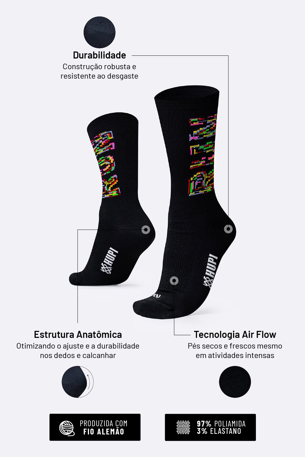 Na HUPI, cada detalhe importa. Por isso, nossas meias esportivas para corrida foram desenvolvidas com poliamida de alta qualidade e estrutura pensada para evitar bolhas, calos e desconfortos durante seus treinos e provas.