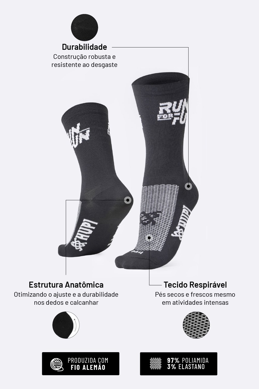 Na HUPI, cada detalhe importa. Por isso, nossas meias esportivas para corrida foram desenvolvidas com poliamida de alta qualidade e estrutura pensada para evitar bolhas, calos e desconfortos durante seus treinos e provas.