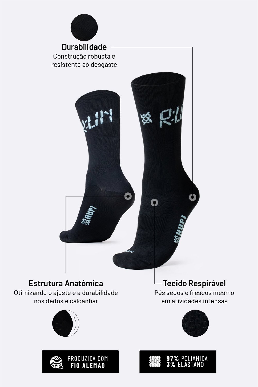 Tecnologias e Benefícios da Meia HUPI Run Preto - Tamanho Plus 42-46