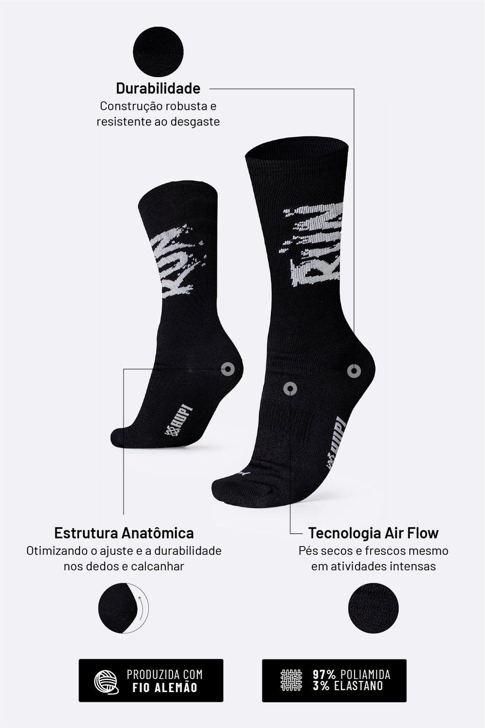 Na HUPI, cada detalhe importa. Por isso, nossas meias esportivas para corrida foram desenvolvidas com poliamida de alta qualidade e estrutura pensada para evitar bolhas, calos e desconfortos durante seus treinos e provas.