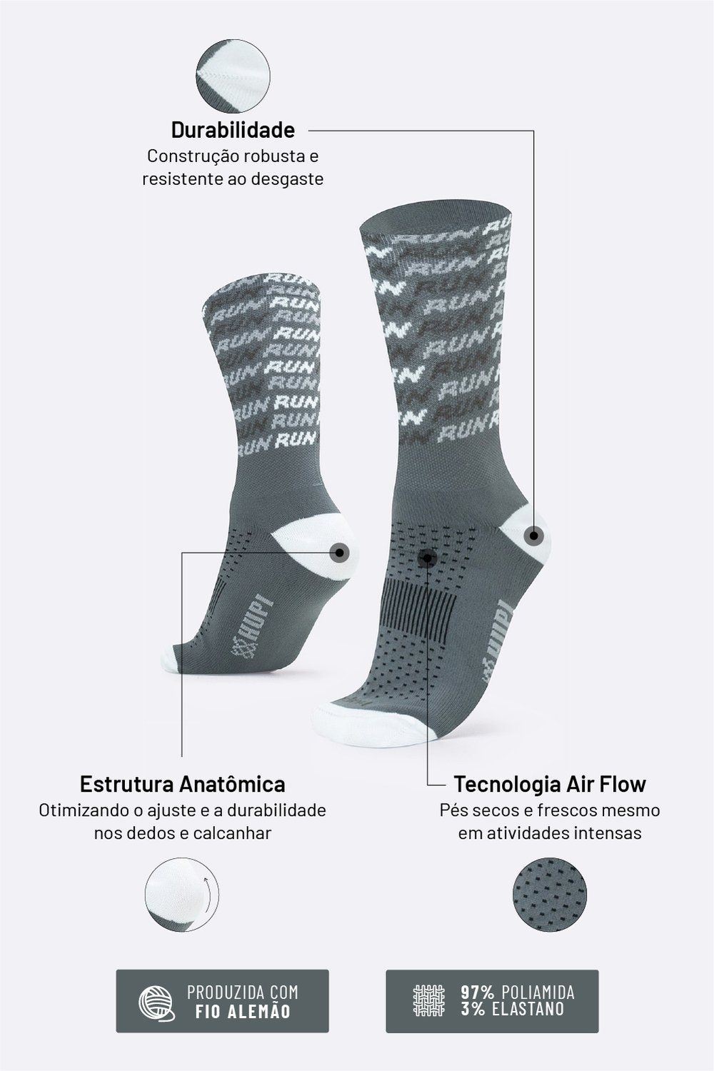 Tecnologias e Benefícios da Meia HUPI Run Tri Cinza Pés Menores 34-38
