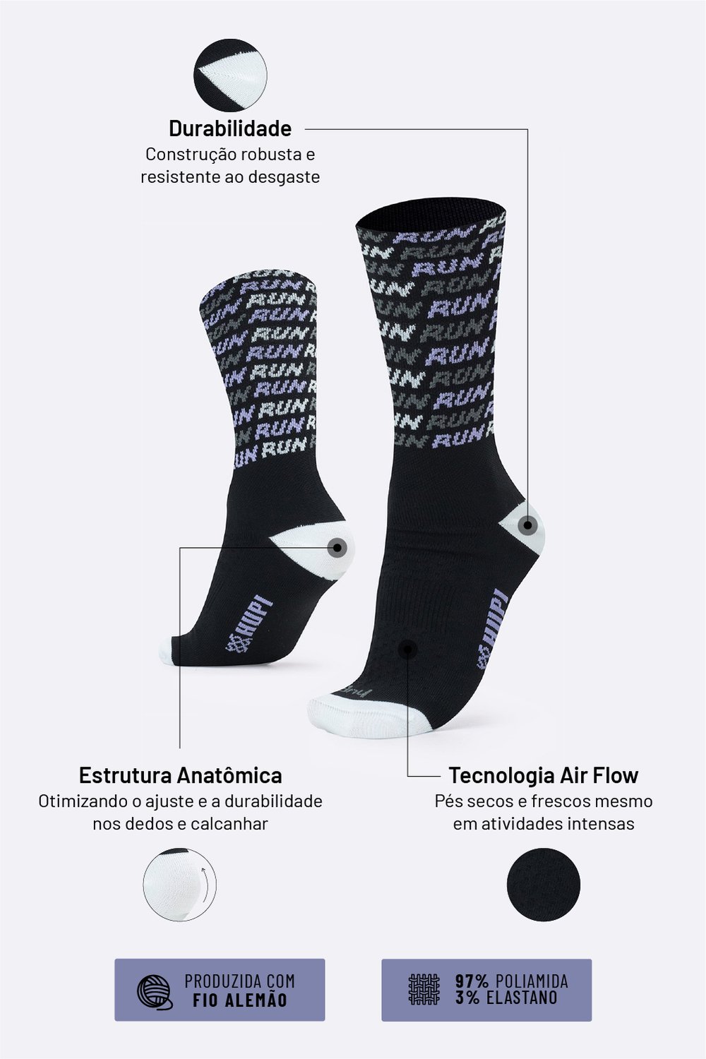 Especificações Técnicas da Meia HUPI Run Tri Preto e Roxo Pés Menores 34-38