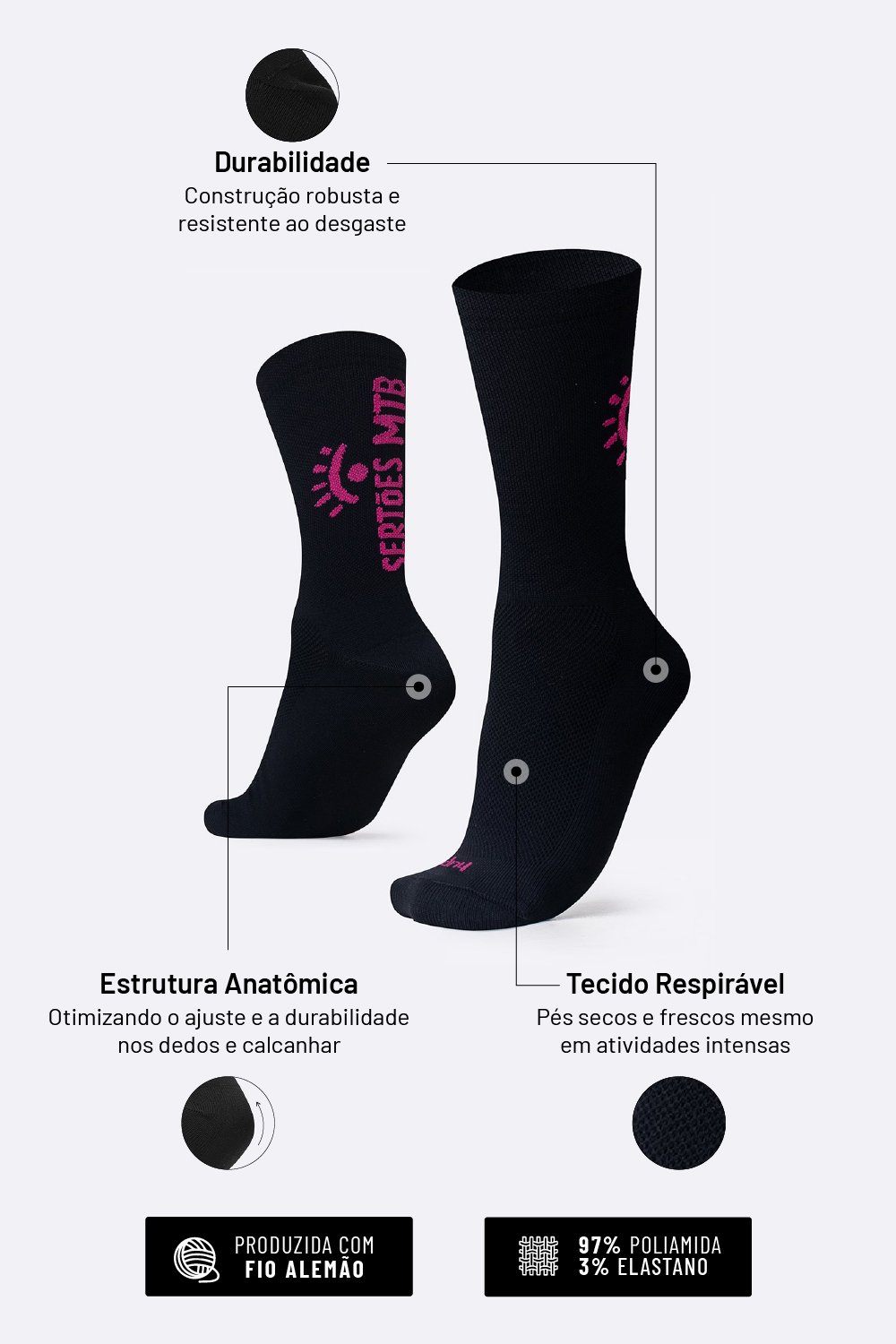 Principais Características da Meia HUPI Sertões Cano Médio Preto e Rosa: