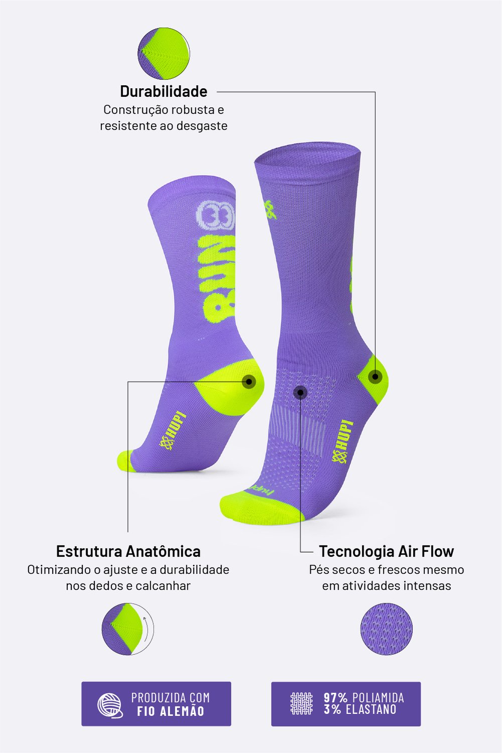 Na HUPI, cada detalhe importa. Por isso, nossas meias esportivas para corrida foram desenvolvidas com poliamida de alta qualidade e estrutura pensada para evitar bolhas, calos e desconfortos durante seus treinos e provas.
