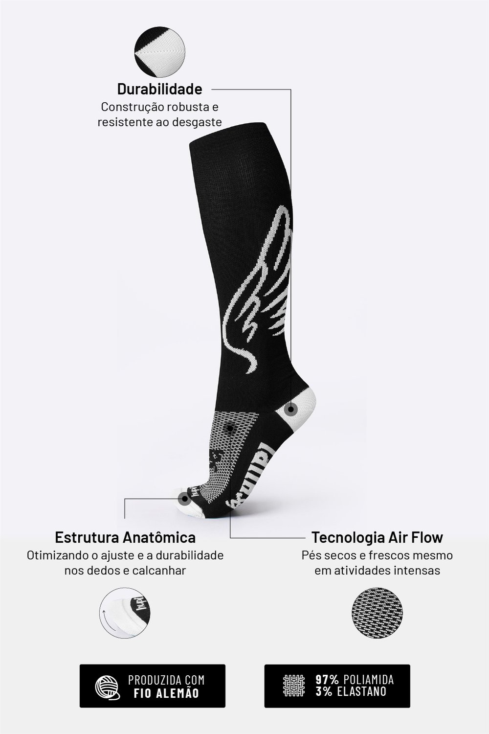 O material utilizado na fabricação da meia é importado da Alemanha. Os fios de elastano e poliamida formam um conjunto cheio de vantagens. O principal destaque é o conforto, proporcionado pela transpiração que a meia cano alto oferece, deixando os pés secos e bem protegidos.