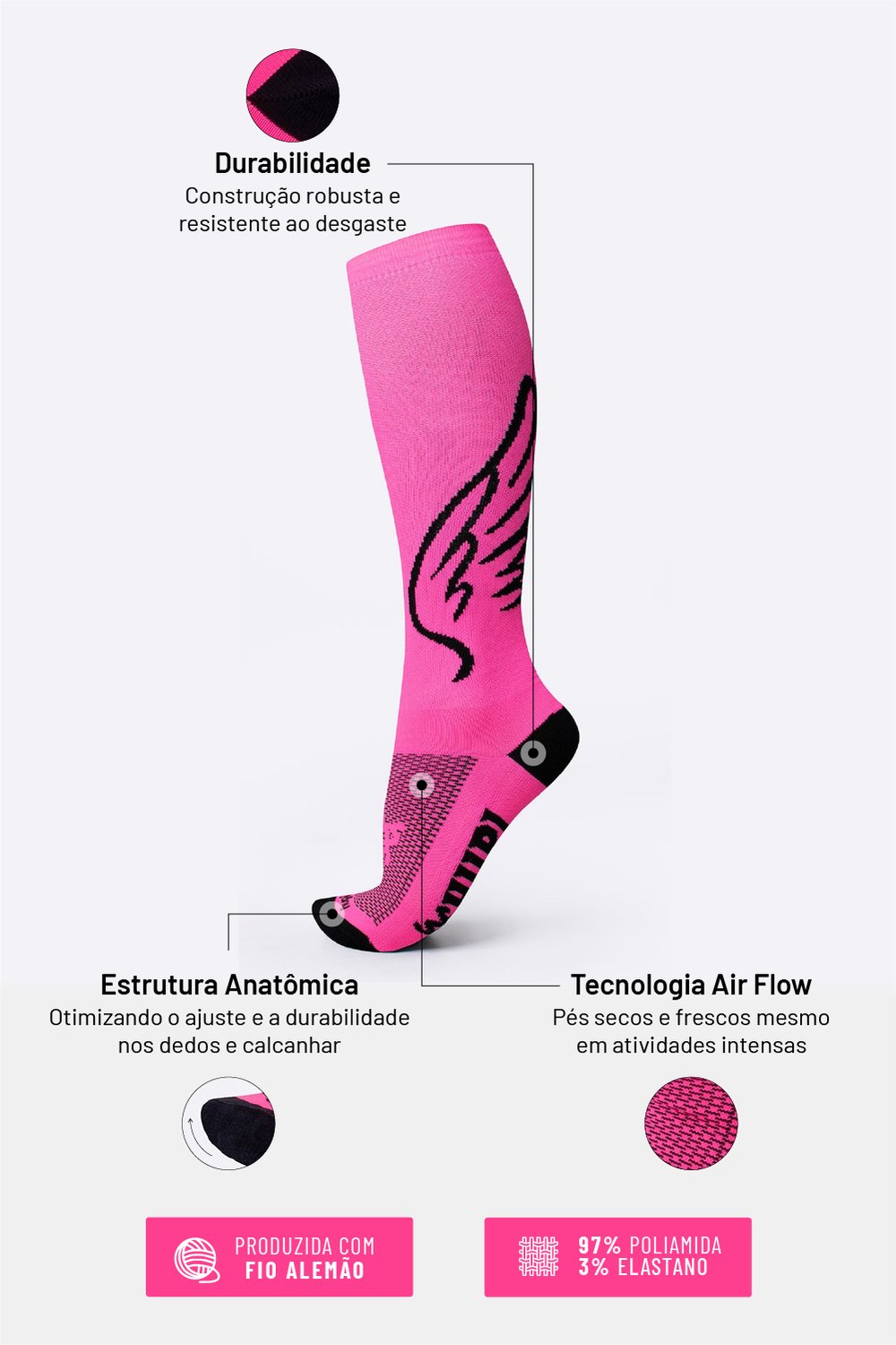 Praticar esportes com conforto e máximo desempenho é o seu objetivo, e também o nosso. Por isso a meia apresenta diversos destaques que fazem dela um item fundamental.