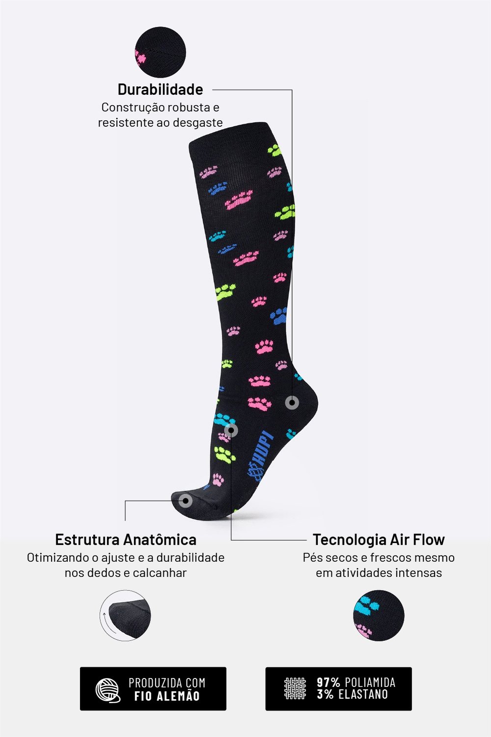 O principal destaque é o conforto, proporcionado pela transpiração que a meia cano alto oferece, deixando os pés secos e bem protegidos.