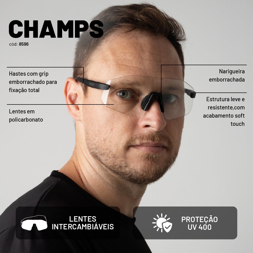 O modelo conta com sistema de lentes intercambiáveis, permitindo substituição conforme a necessidade. Essa versatilidade amplia o uso em diferentes horários do dia e níveis de luminosidade, tornando o Champs uma solução técnica adaptável.