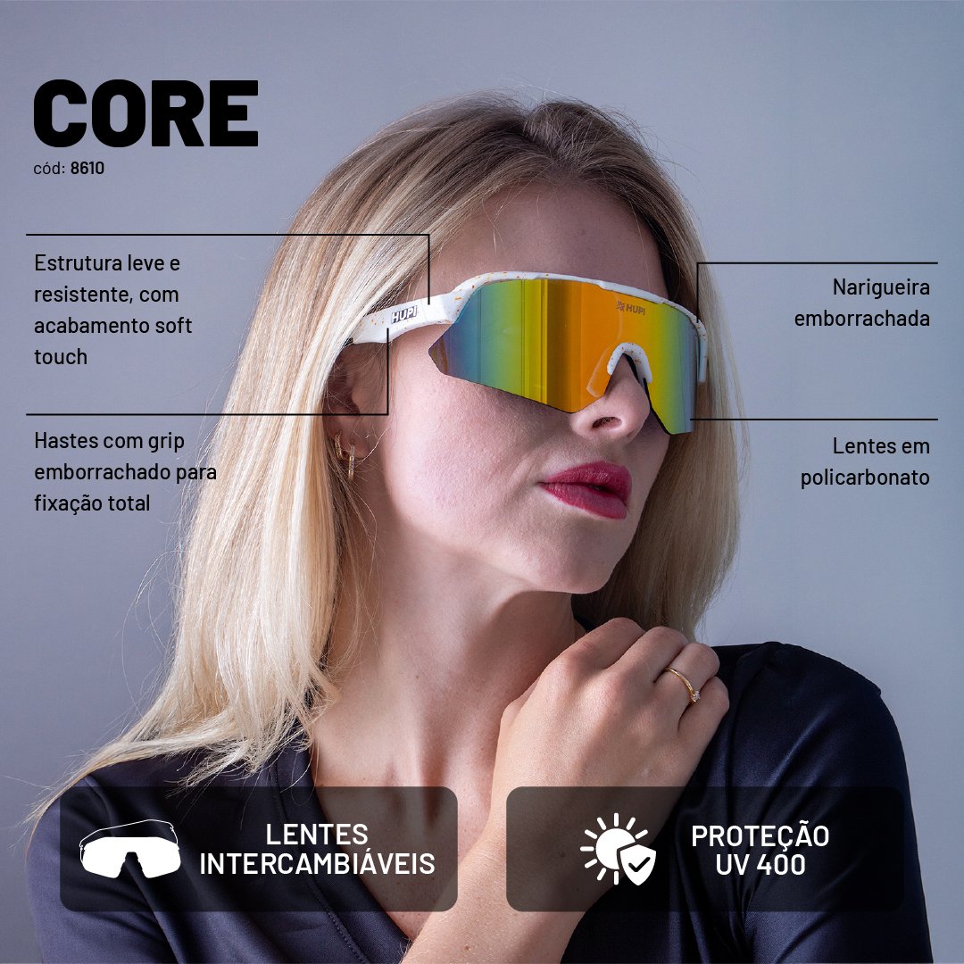 O HUPI Core Branco com lente dourado espelhado combina estética sofisticada com desempenho funcional. Como óculos de corrida, entrega estabilidade estrutural, proteção solar completa e controle eficiente de luminosidade.