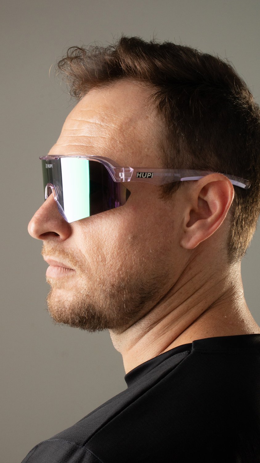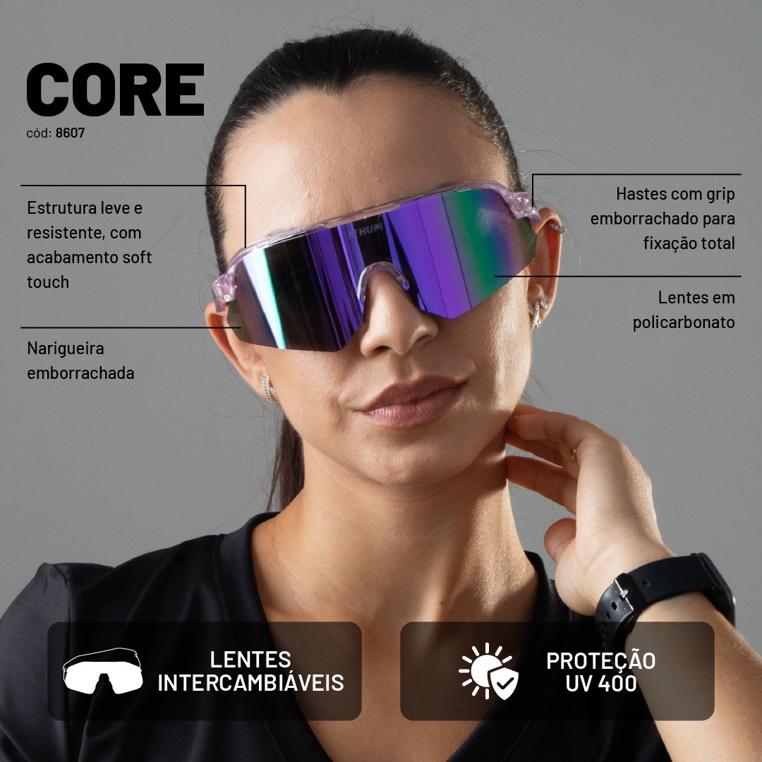 O HUPI Core Cristal Roxo combina estética impactante com desempenho técnico. Como óculos de corrida, entrega estabilidade estrutural, proteção solar completa e controle eficiente de luminosidade.