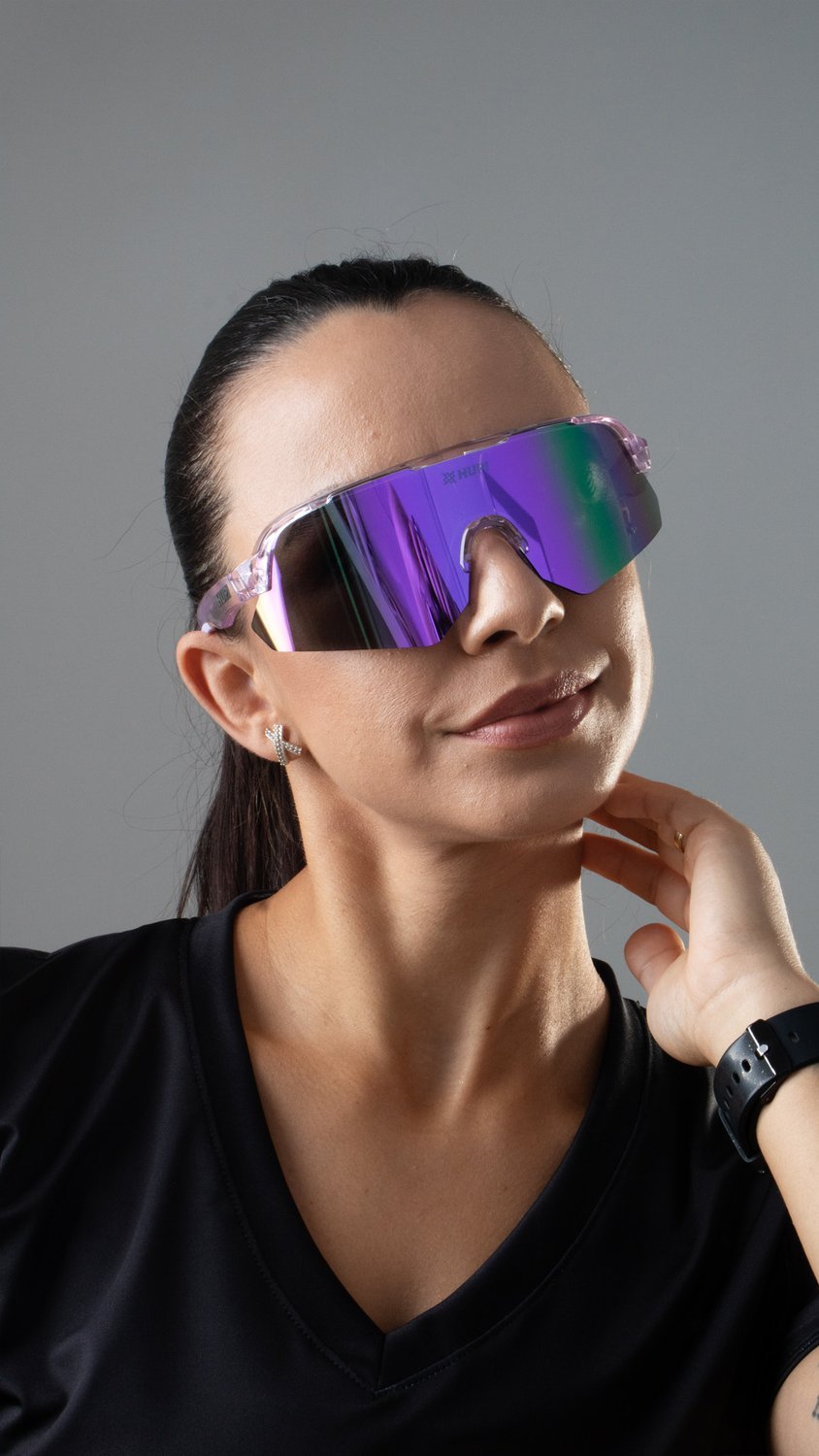 A armação cristal roxo reforça personalidade e diferenciação, enquanto a lente roxo espelhada entrega controle eficiente de luminosidade em treinos ao ar livre.