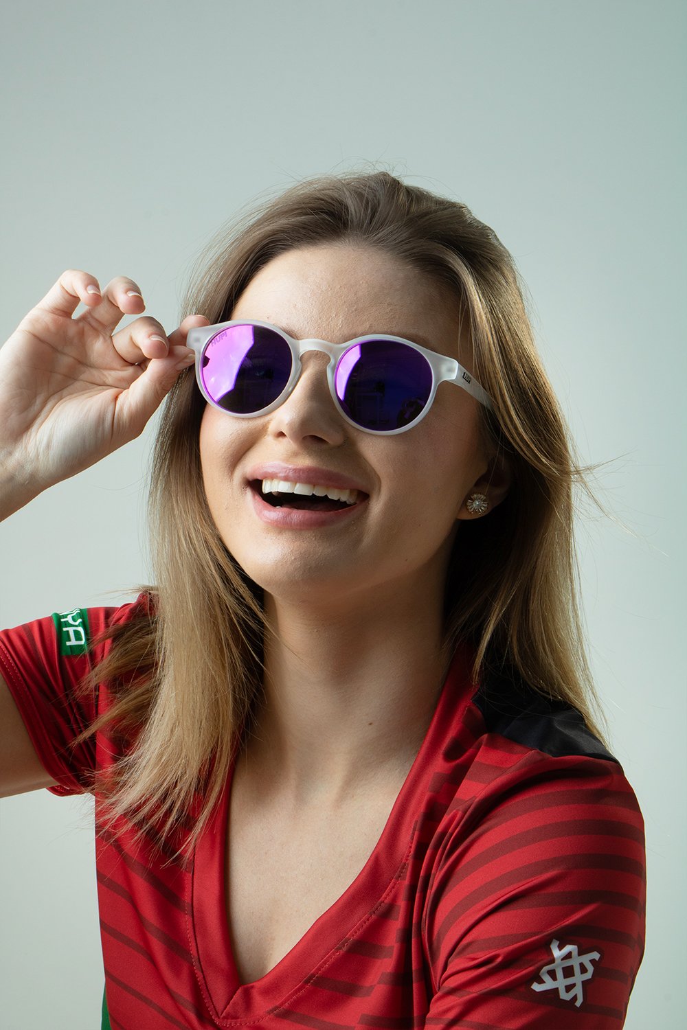 Lentes Espelhadas Roxas: A lente espelhada proporciona um visual arrojado e moderno, além de aumentar o contraste e a definição em ambientes de alta luminosidade.