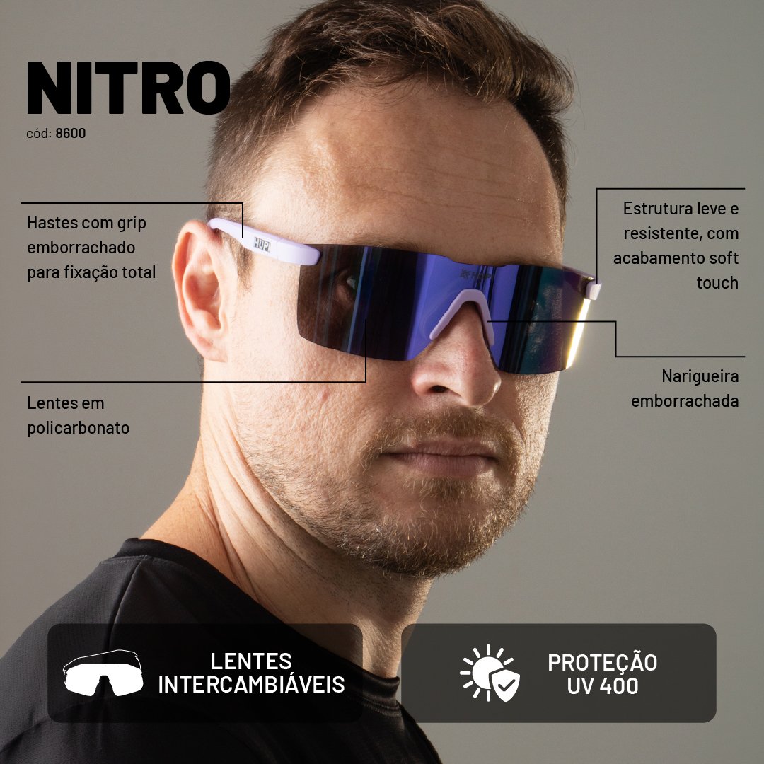 O design esportivo rimless com monolente cria uma superfície visual contínua, reduz interferências periféricas e reforça a identidade agressiva da linha Nitro.