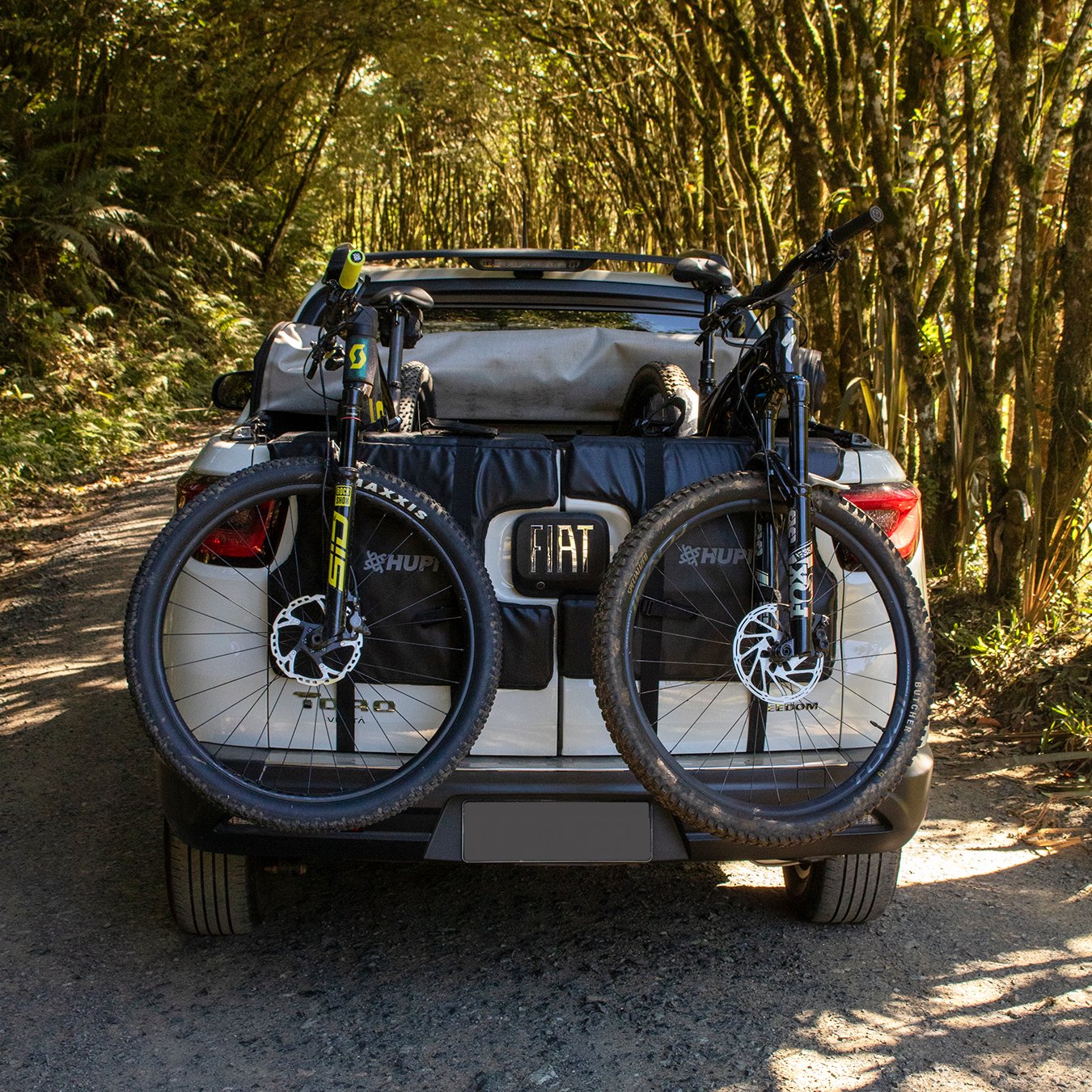 Transporte de bicicletas em Fiat Toro: Proteção eficiente sem bloquear a tampa bipartida.