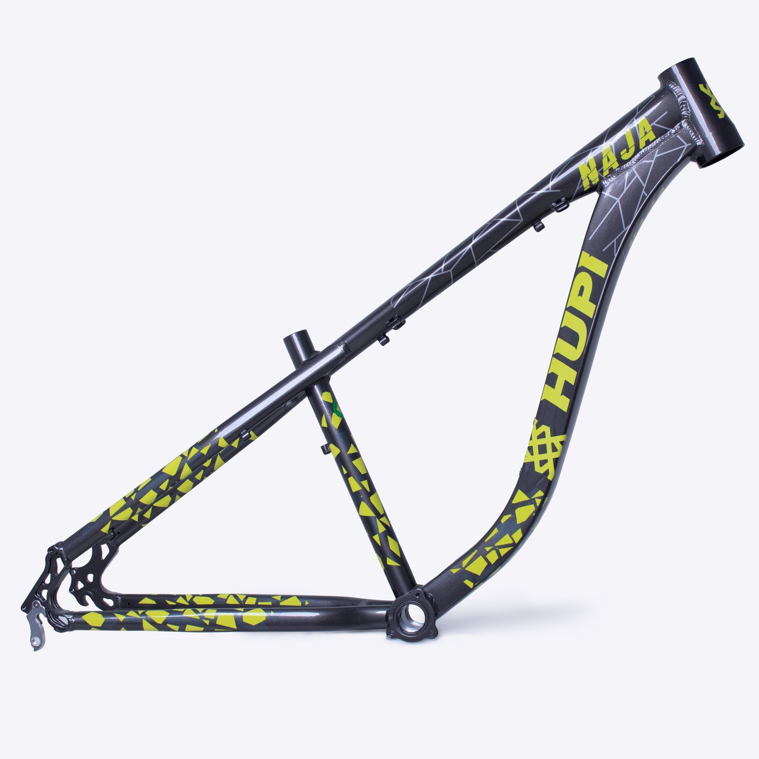 O Quadro HUPI Naja V9 Grafite/Amarelo com Gancheira Vertical é indicado para ciclistas que buscam uma bike versátil, resistente e estilosa, seja para trilhas, manobras ou pedais urbanos.