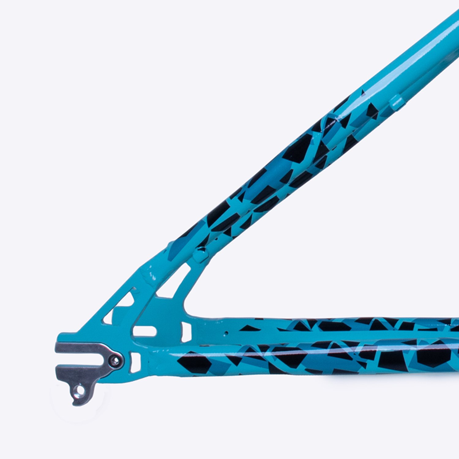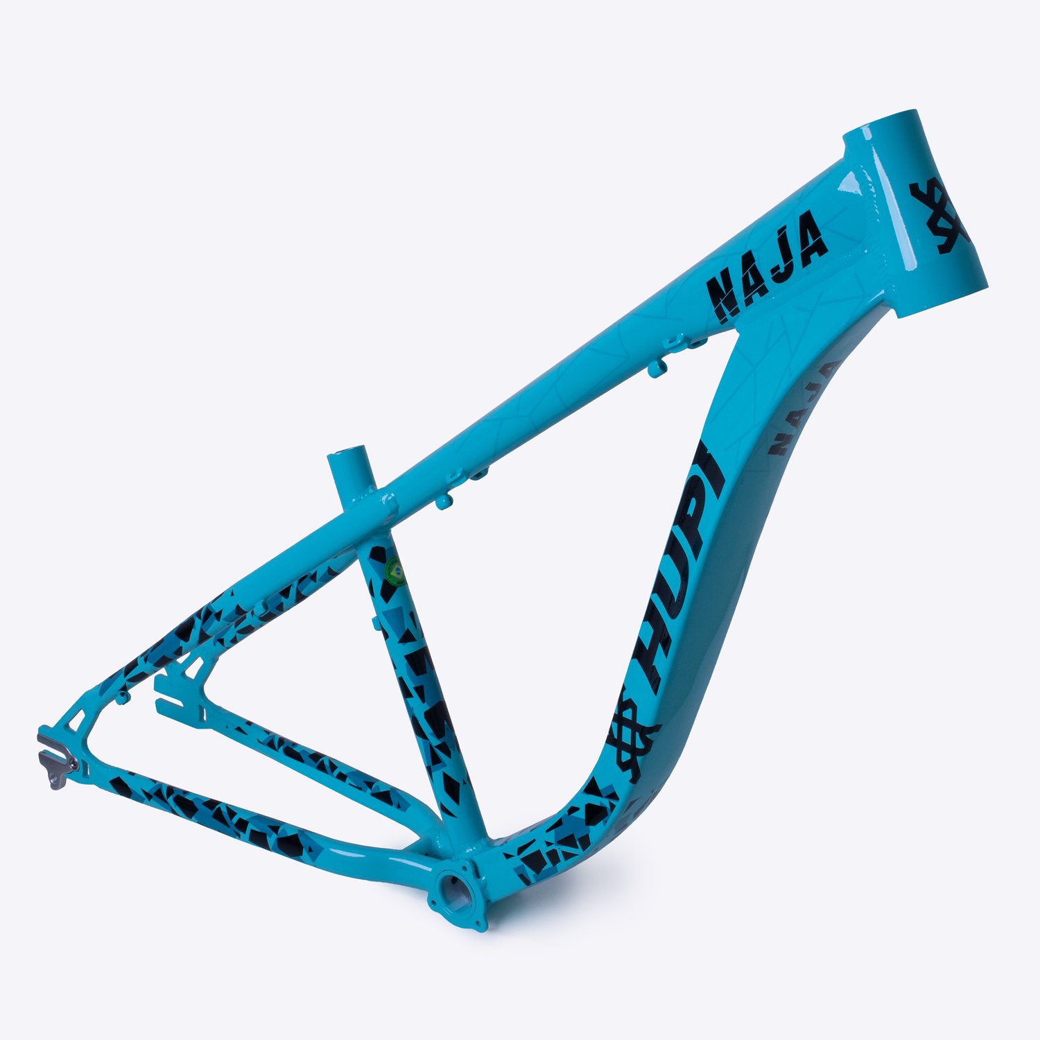 O Quadro HUPI Naja V9 Verde Claro com Gancheira Horizontal é perfeito para trilhas leves, pedais urbanos ou montagem de uma bike personalizada.