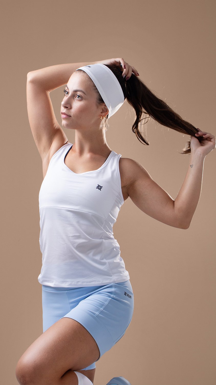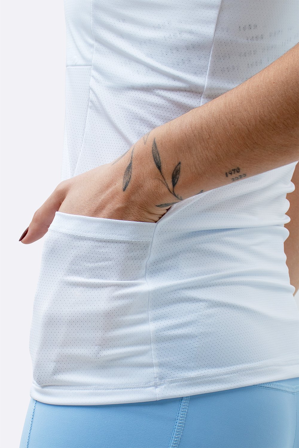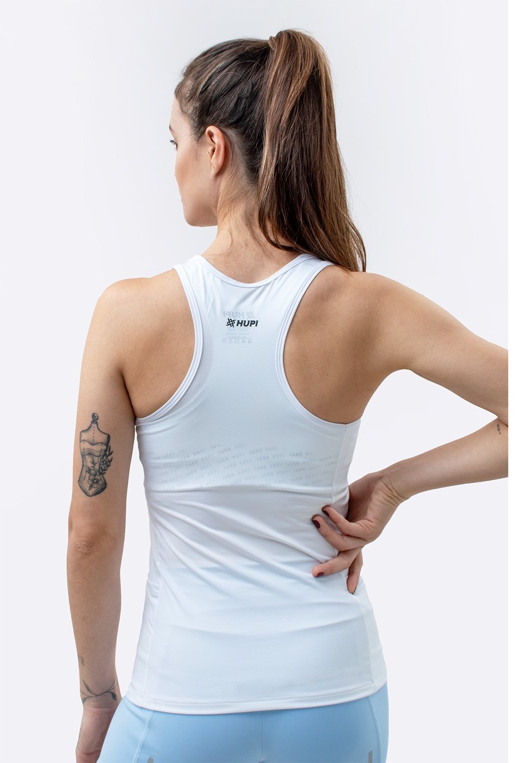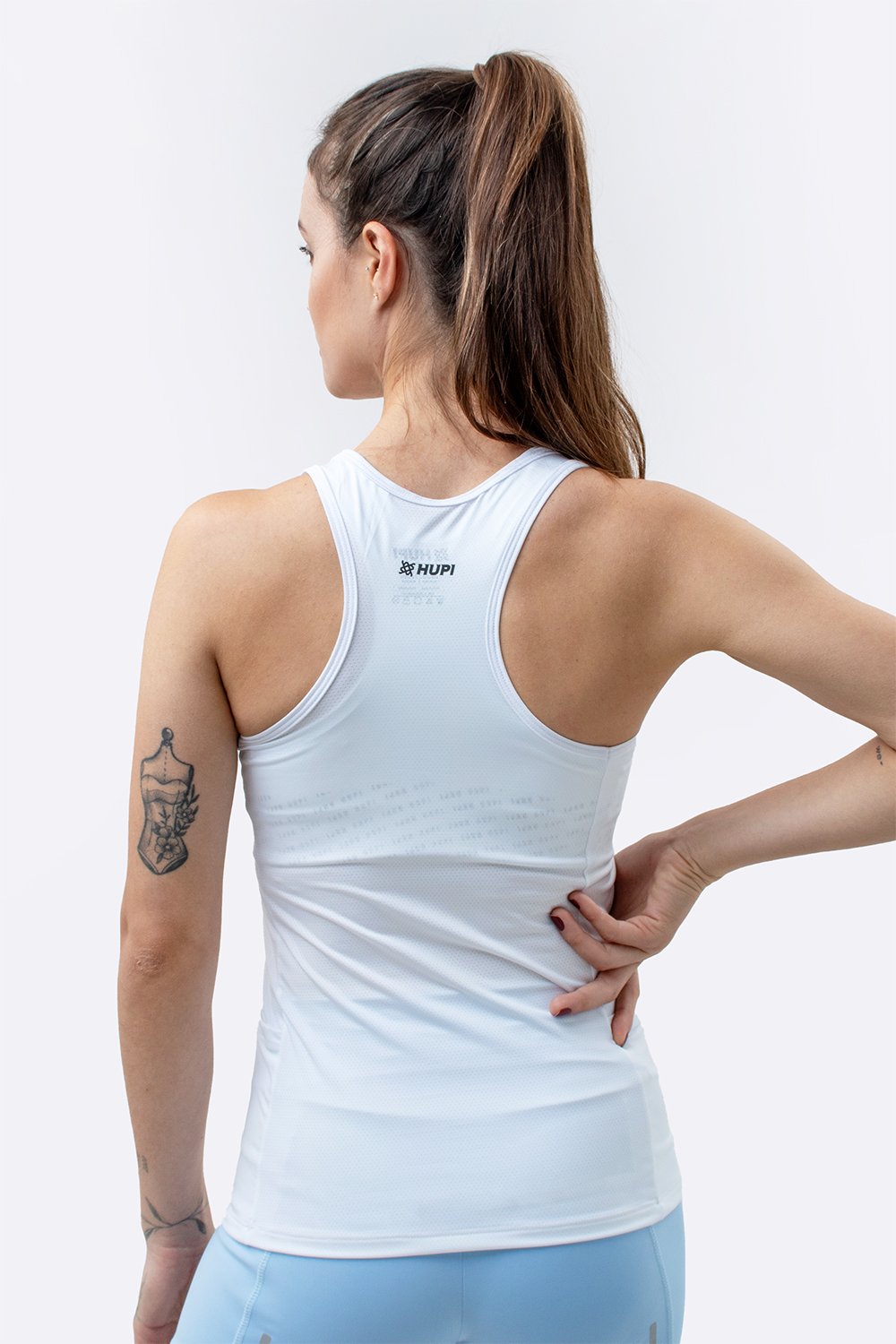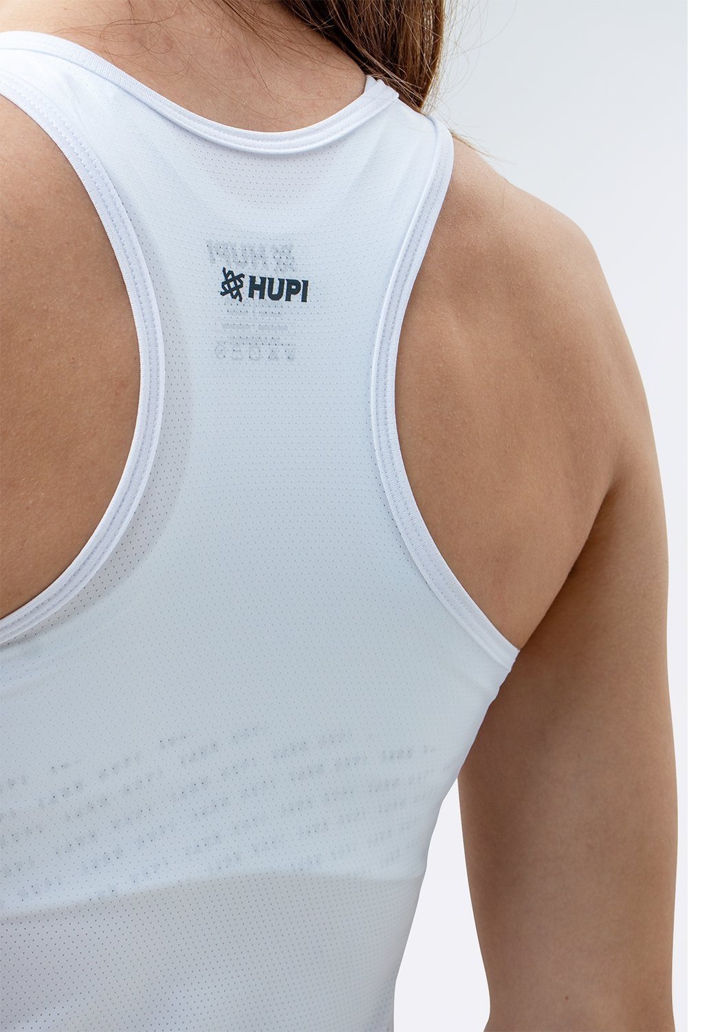 A Regata HUPI Lisboa Branca foi desenvolvida para treinos de alta performance, oferecendo liberdade, conforto e praticidade em cada movimento.