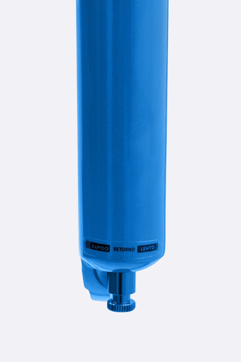 O botão de retorno, localizado na base da perna hidráulica, permite ajustar a velocidade com que a suspensão volta à posição inicial: sentido horário para retorno mais rápido e anti-horário para retorno mais lento.