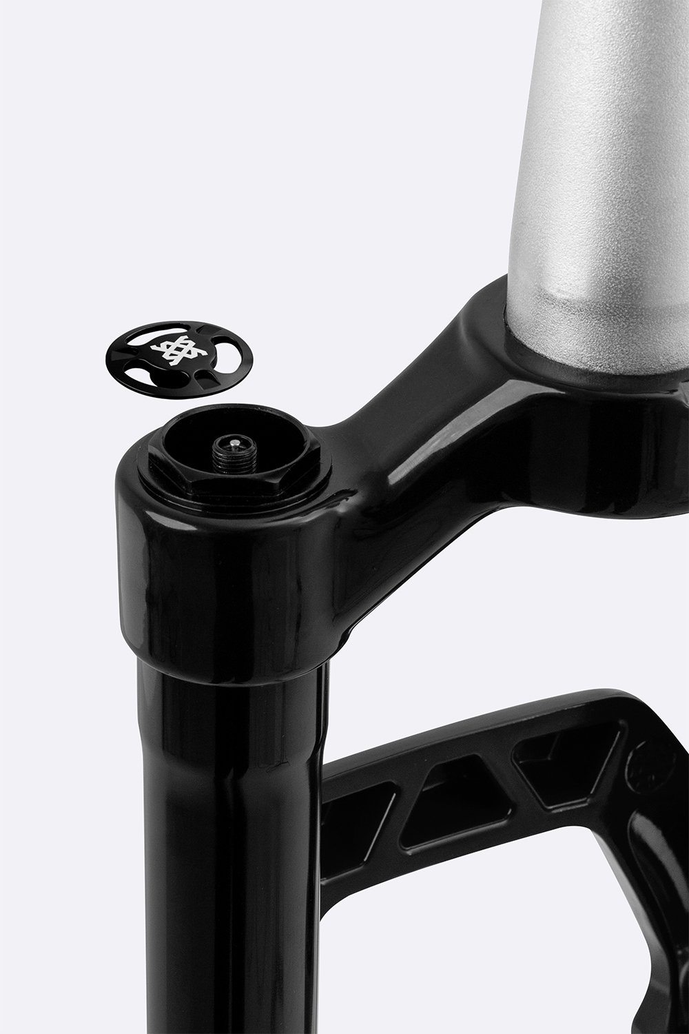 O botão de retorno, localizado na base da perna hidráulica, permite ajustar a velocidade com que a suspensão volta à posição inicial: sentido horário para retorno mais rápido e anti-horário para retorno mais lento.