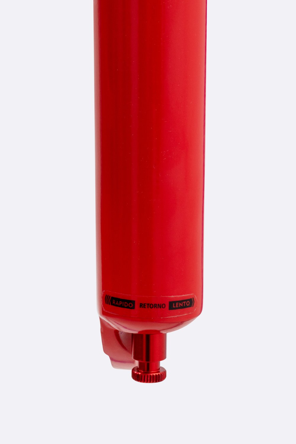O botão de retorno, localizado na base da perna hidráulica, permite ajustar a velocidade com que a suspensão volta à posição inicial: sentido horário para retorno mais rápido e anti-horário para retorno mais lento.