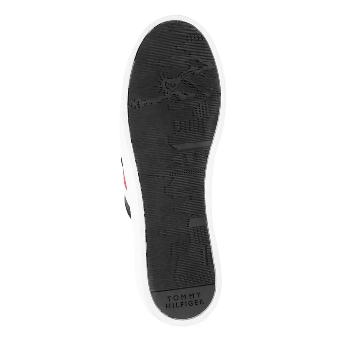 A palmilha também exibe a estampa da marca, e na parte posterior do calçado, a icônica bandeira da HILFIGER está aplicada, destacando a autenticidade do modelo. O bico arredondado contribui para o conforto e a estética atemporal do design.